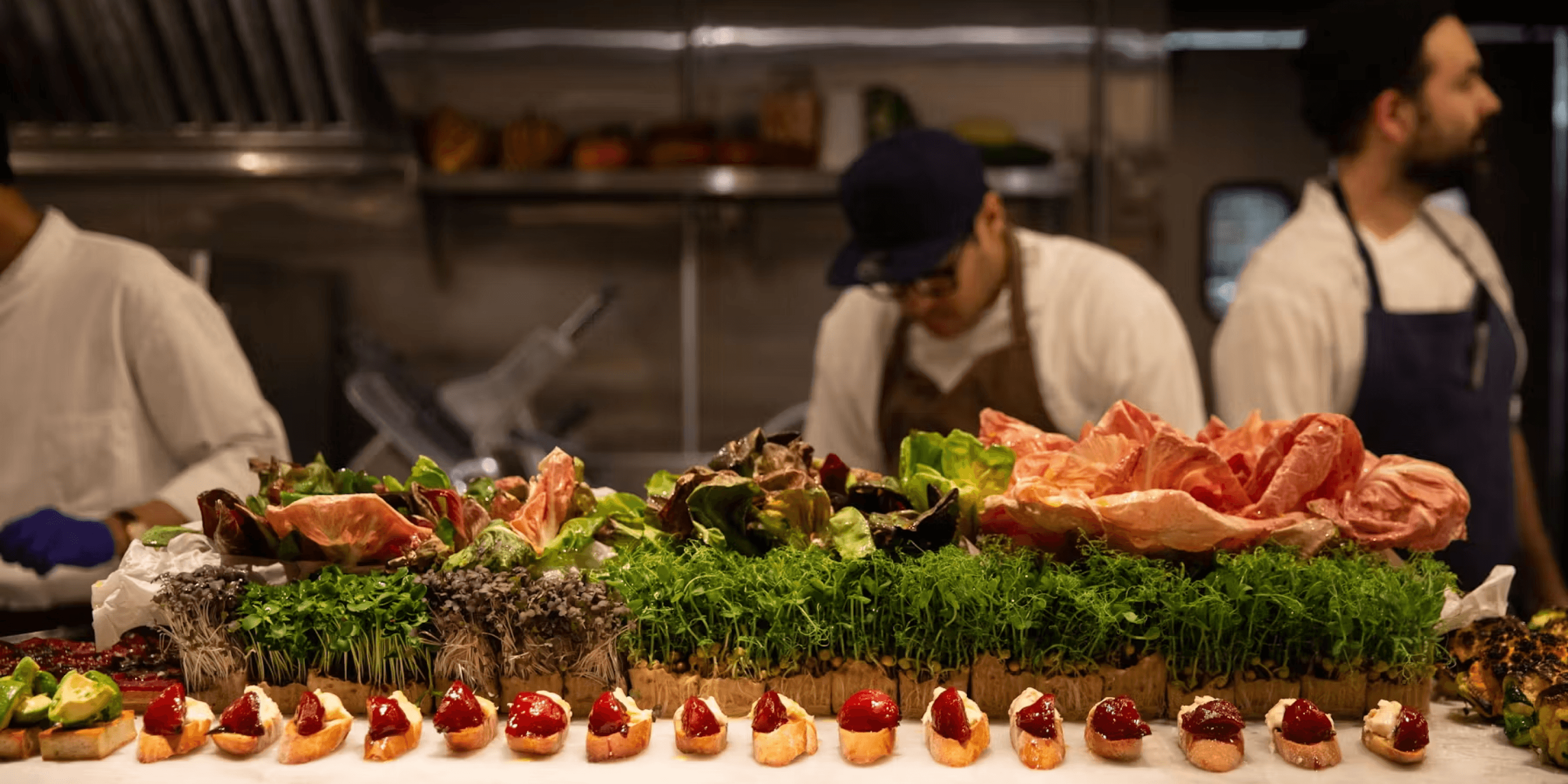 HASALON features two elegant private dining rooms, a stylish covered patio, and a dramatic main dining room with soaring vaulted ceilings and a striking open kitchen. Every space can be reserved for private events, available seven days a week.